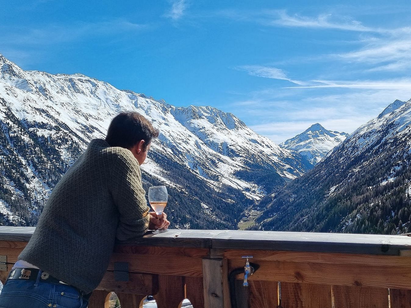 Die große, überdachte Veranda ist wie gemacht, um die Berge zu spüren und die frische Bergluft tief einzuatmen. An den Tischen und Bänken lässt sich der Morgenkaffee genießen, ein Buch lesen oder einfach das Panorama wirken. Die Sonnenliegen laden ein, die Beine auszustrecken, die Sonne auf der Haut zu spüren und den Tag ungestört zu genießen.
